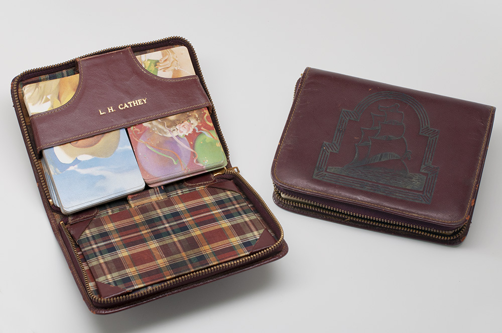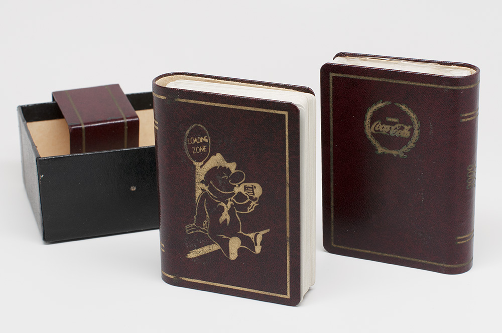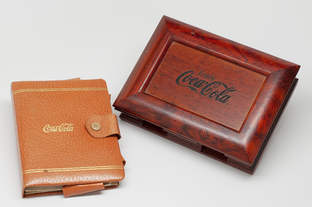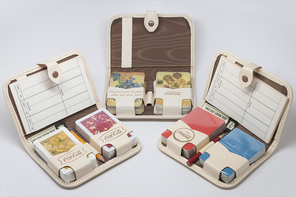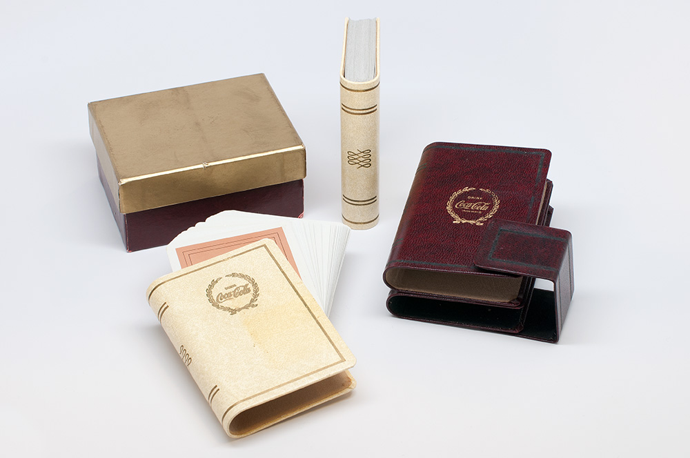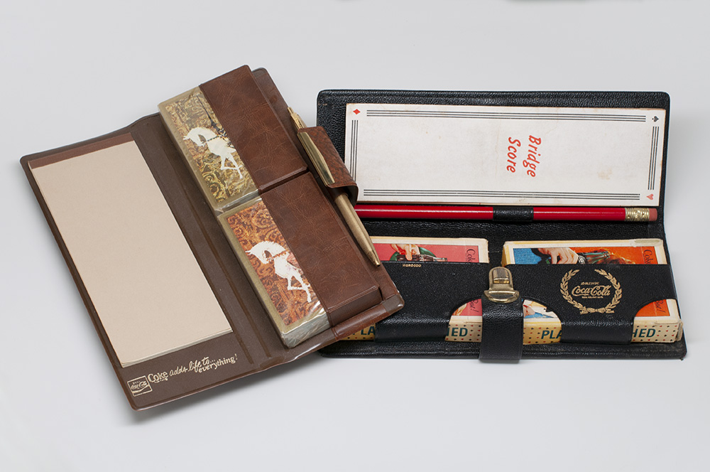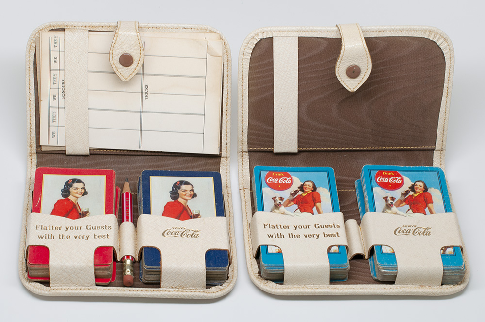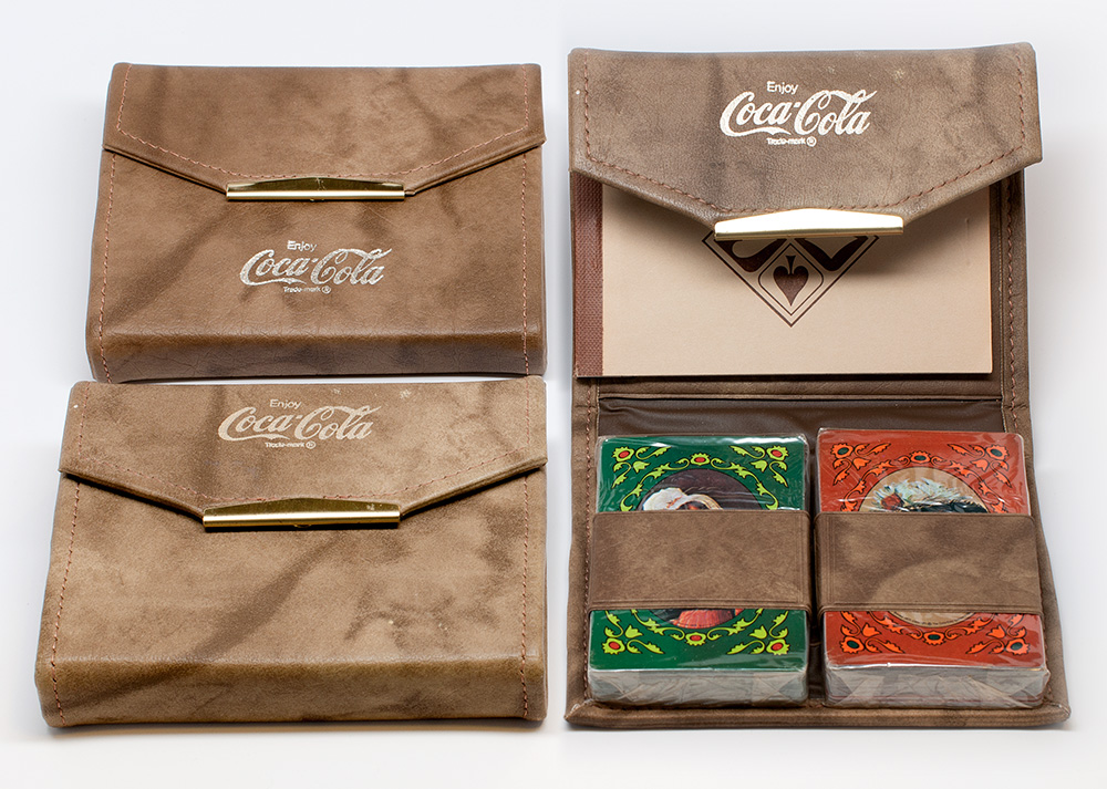 View in GalleryShown are several double deck sets, most of which I think were probably gifts to customers or rewards to employees. The first comes from the Coca Cola Bottling Company of New York and appears to be tan leather. The cards inside are not Coca-Cola decks and are bridge decks. They were manufactured by the US Playing Card Co. Based on the bridge information card and the bridge information at the back of the score pad, this appears to be from the late 1930s or early 1940s. Another one is a darker leather, and is labeled as “Meritorious Service 1952 Hund & Eger”. It also does not have Coca Cola cards inside. The cards are bridge decks presumably were produced before or in 1952 and were manufactured by the US Playing Card Co. They are labeled “606 Congress" with an M 1662 code on the ace of spades and a 56 79 code on one of the extra cards/jokers. Another one is also tannish leather with “Drink Coca-Cola” on the outside. The cards are the reproduction early Coca-Cola girl decks. The score pad is in English and French, making me wonder if this is Canadian. I would guess it is from the 1970s or 80s. It has an unusual pen and loop closer. Next is a white or ivory leather that has “Drink Coca-Cola” in the fishtail logo stamped on the deck holders. The decks are bridge and not Coca-Cola. They were manufactured by the International Playing Card Company in Windsor, Canada. I would guess they were made in the late 1950s or early 60s. Next is a greyish/tan vinyl-like set with “Enjoy Coca-Cola” on the cover and two of the reproduction of early Coke girls decks inside. I am guessing 1970s for this set. The outer box is with this set. Next is a black leather set holding the decks lengthwise. This set has “Drink Coca-Cola” on the deck holder in gold with a leaf circle. It came with a used bowling girl and bridge-playing girl pair of Coca-Cola decks, so I am assuming it dates from about 1961. Next is a black vinyl double deck of the flapper girl set that says “Institutional Food Service Division Coca-Cola USA” on the inside, which is probably a meeting give away. Next is another set of early Coke girl reproduction decks with “Enjoy Coca-Cola” on a black cardboard box. I assume this is from the 1970s. A set in a plastic box with a gold and red “Enjoy Coke” with a wave metal label has two non-Coke decks in it. They have a fleur de lis design and say on the one card that can be seen that they were made for Zippo by the US Playing Card Co. I would guess 1970s or 1980s for this set. A nice wooden box with a metal engraving of the Coca Cola Company headquarters had no decks in it. Another wooden box with the Have a Coke and a Smile logo and multiple country logos around that also had no decks in it. A set of double decks came in an unusual fold-out holder that does not have Coca Cola on it but has a diet Coke and an “Enjoy Coke” with a wave deck, so I think this is from the 1970s. Decks are sealed and I am not sure who the manufacturer is. Finally, there is the eight pack double deck, said to date from 1970. The cards have four Coke bottles on them and the decks are sealed so I again cannot identify the manufacturer.