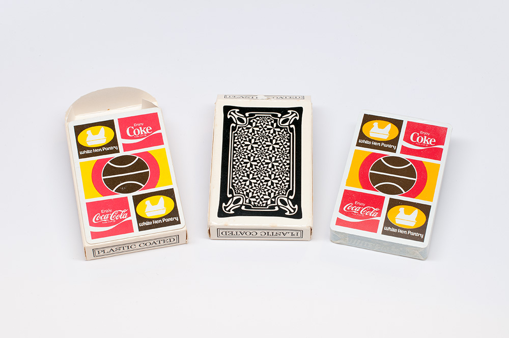 View in GalleryA deck that celebrates the Milwaukee Bucks, put out by White Hen Pantry in the 1970s, with pictures of the players on cards. Bruce Jacobs sent the photo of the deck that is identical but does not have the basketball players. A boy scout jamboree deck from 1971, red cards with a white Drink Coca-Cola wave logo box. Vendo machine decks, red, with a soda machine outlined in gold, some of these decks have Vendo at the bottom of the cards and some say “Have a Coke”. The border is laced red and burgundy. From the ARRCO playing card company and I would estimate dating to the 1950s.