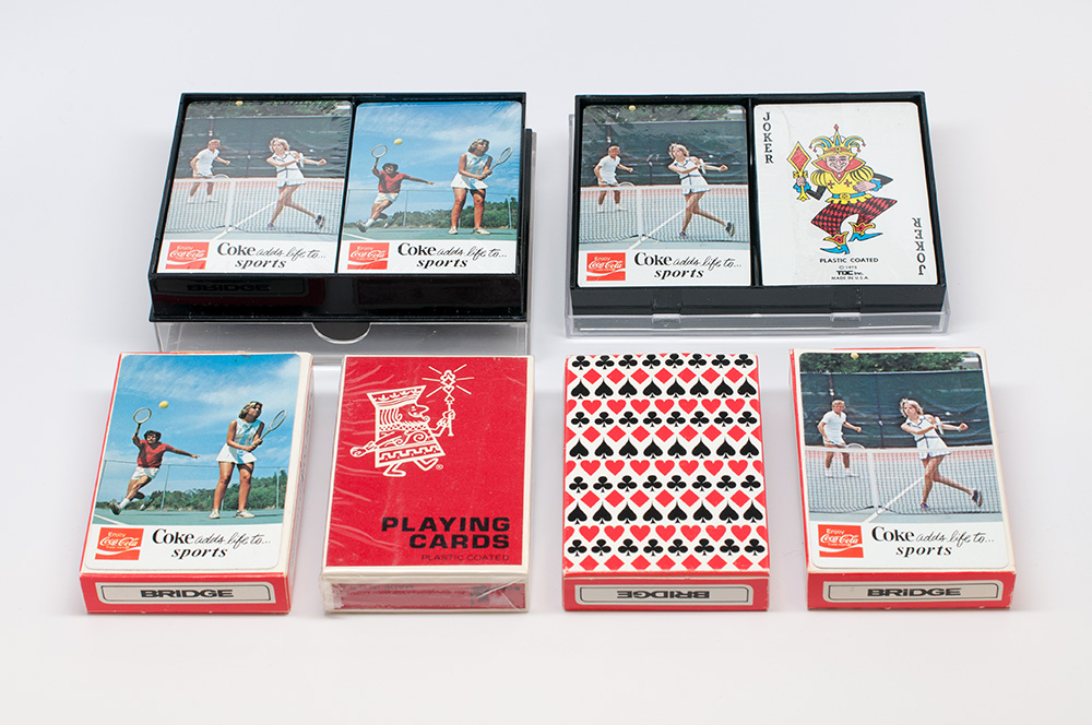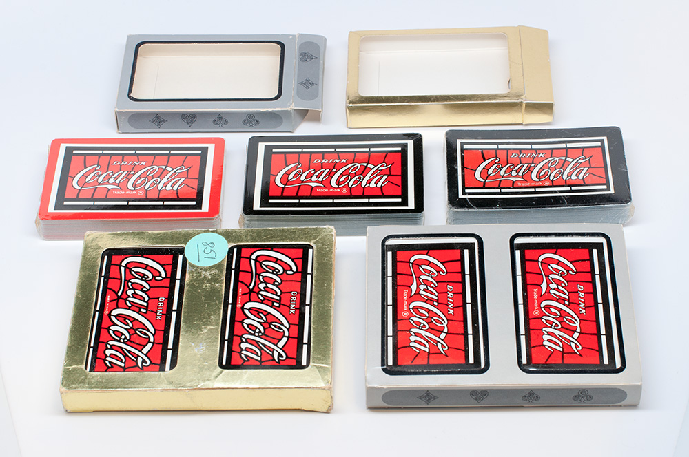 View in GalleryAs we got into the 1970’s and 1980s, a number of decks were put out, some in large quantities, some smaller, some ordered by the Company, some probably by bottlers and some not authorized. In no particular order in regard to the photos are two 1973 decks with the “it’s the real thing” theme; one has a girl sitting in grass and the other a spread of food and Coke. A pair of tennis decks from 1975 made by TDC Inc. Shows two different couples playing tennis, comes in single and double deck versions. There are a number of “Have a Coke and a Smile. Coke Adds Life.” Decks. Some have a red background and some a white. There are single and double decks and one white background version has an Enjoy Coca-Cola box logo. Also are a large number of “Coke is It” decks, red background, variations in the trademark. Two “Coca Cola adds life to everything nice” decks, with images of different activities, that date to 1976 or so. Two versions of decks with the same phrase but in repeated running script, one red and one black on white backgrounds, some single, some double decks. A pair of decks, found single in a gold box or double in a plastic case, one image is a soldier playing with an infant and one is young men in a soda fountain. The so-called Tiffany decks, with a veined red background and red or black border. They say “Drink Coca-Cola” Some are in silver cutout top boxes, some in gold. There are also double decks. There are variations of the border size and trademark statement. These are from the 1970s. A relatively hard to find 75th Anniversary Enjoy Coca-Cola deck from Hygeia bottling company, in a silver cutout top box. A white background, red print old soda machine deck in a gold cutout top box, made by Gemaco, likely from the 1970s. A Race for Safety deck, made by the Company or a bottler, likely for employees, with safety tips on each card, probably from the 1970s. “Coca-Cola adds music to my life” deck, white background, red image and words. Perhaps made by Liberty, likely from the 1970s. An Adventure 87 double deck, one red, one white in a red feltish box. This deck was made in 1987 for a competition among bottlers in which the winners won a trip. A pair of similar decks in a black cutout box is also likely from the 1970s, with Santa on one deck and the Sprite Boy with a bottle on the other. There is a yellow border with a flapper girl deck, made in Hong Kong. There is an Asian woman with a bottle deck, yellow border, Have a Coke and a Smile on the sides of the box, also likely made in Hong Kong. Several decks with pictures of older advertising female images, including a double deck.