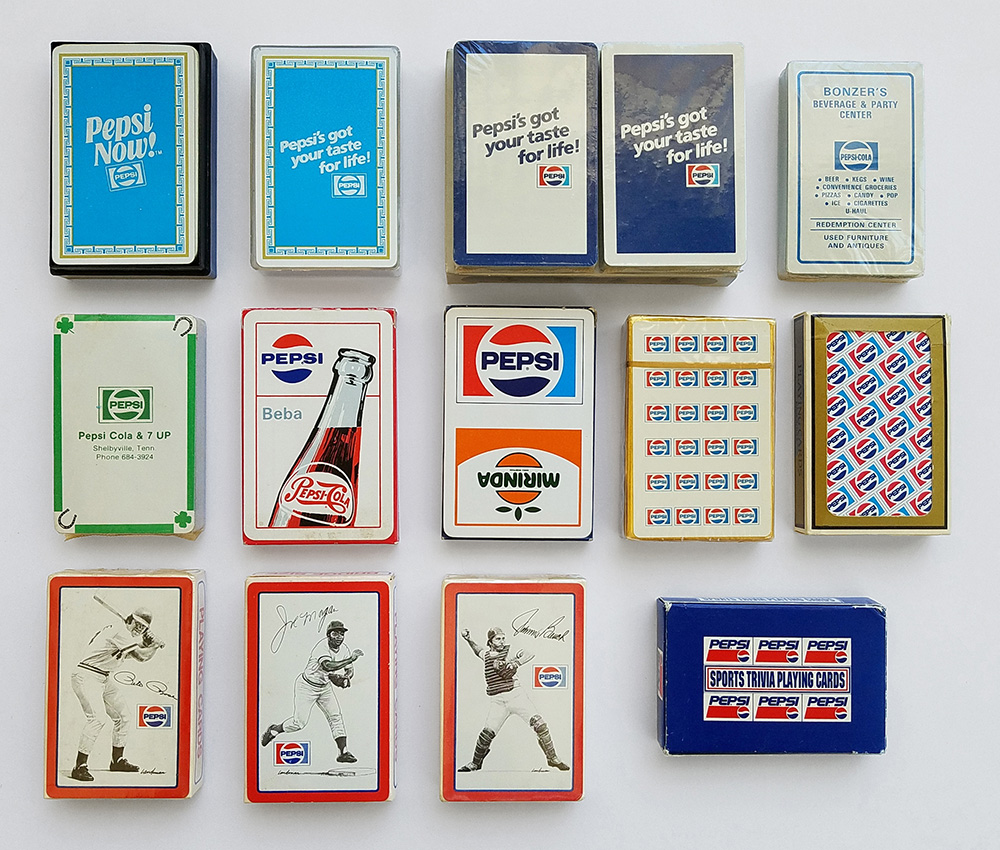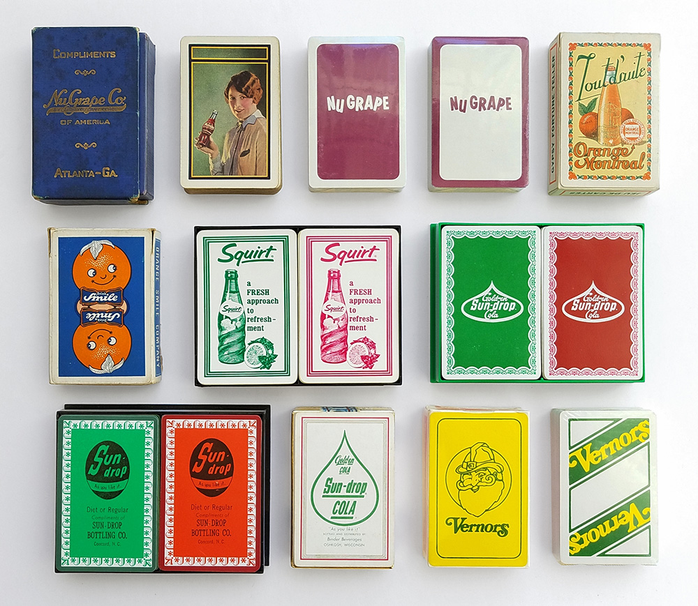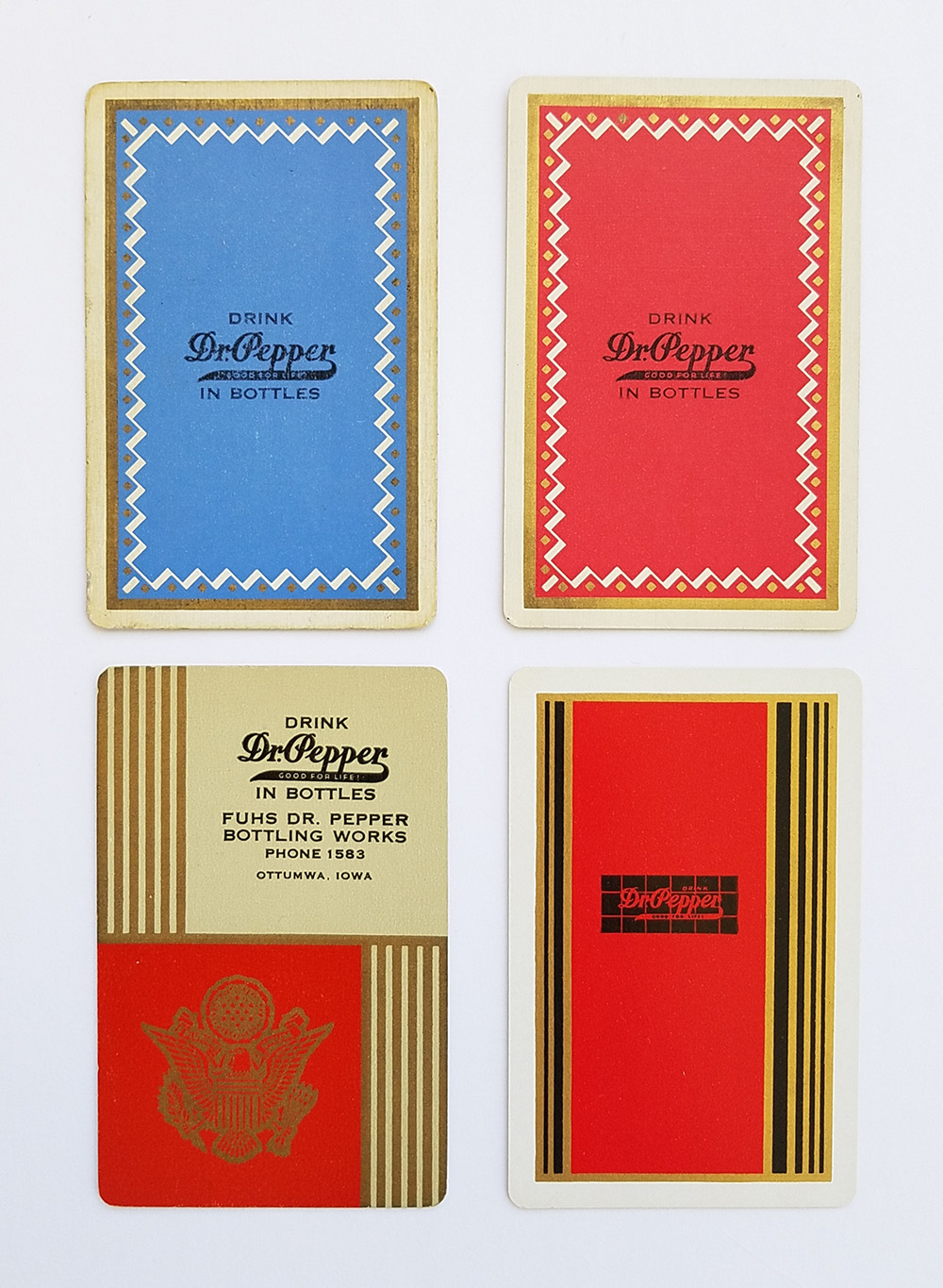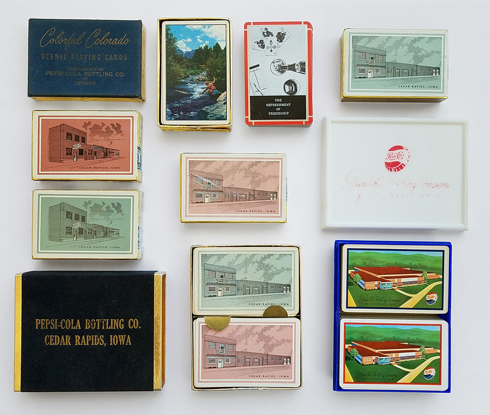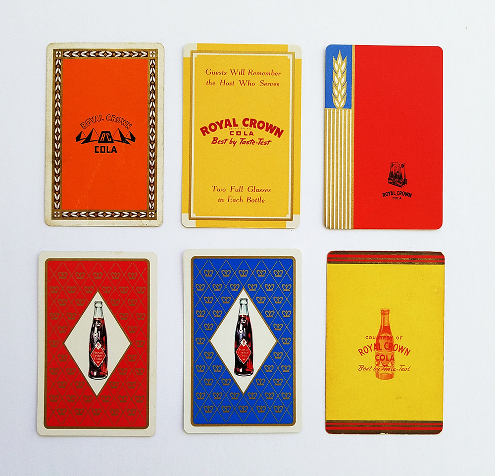 Coca Cola used just about any household item you could imagine for advertising, including playing cards, which were used in almost every American home. Some were ordered by the Company or could be ordered by bottlers through the Company, but many of the most unique decks were clearly ordered by individual bottlers, probably in relatively small lots. If you look at the pictures, you will see many of the same designs that were used by Coca Cola bottlers featuring other advertisers. You can imagine the playing card salesperson sitting down with the marketing person at a bottler and going through his samples of card designs, trying to get an order. Not the easiest life, and I would imagine you had to sell a lot of decks to make a decent commission.