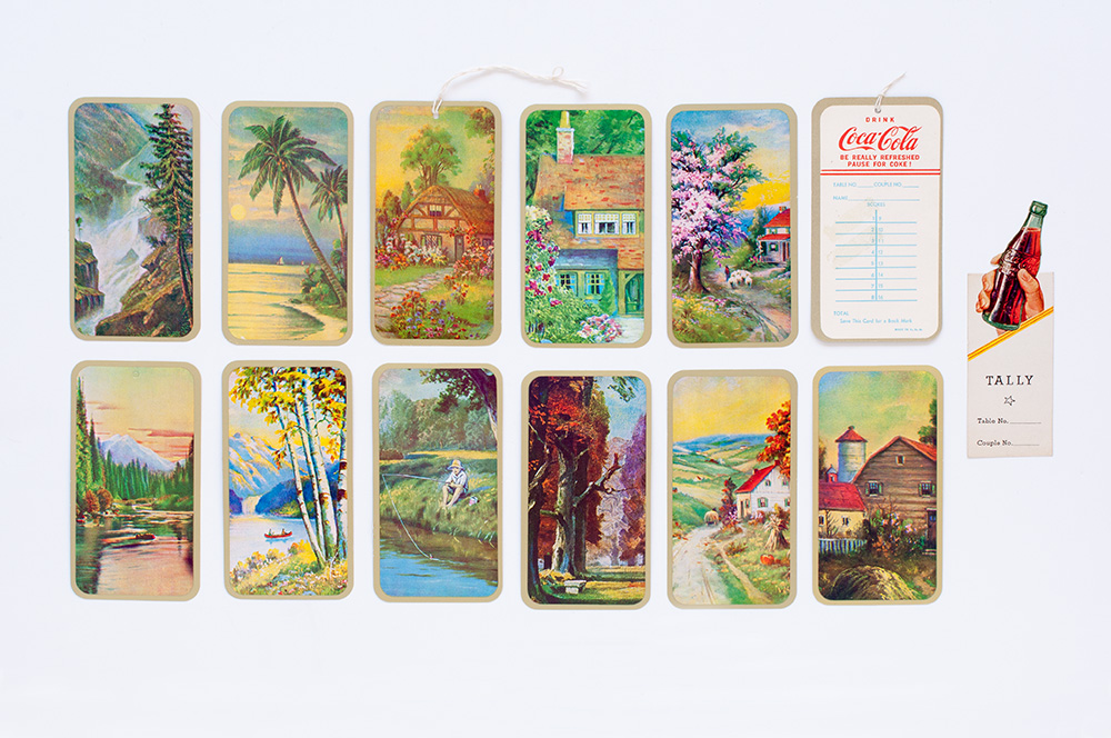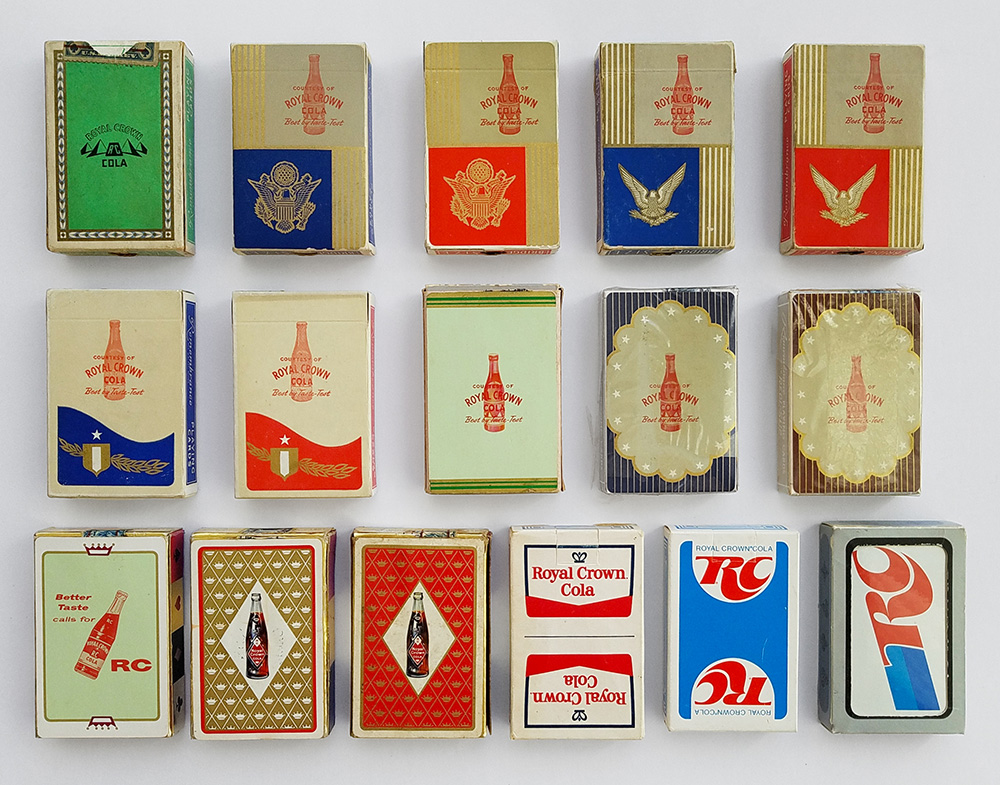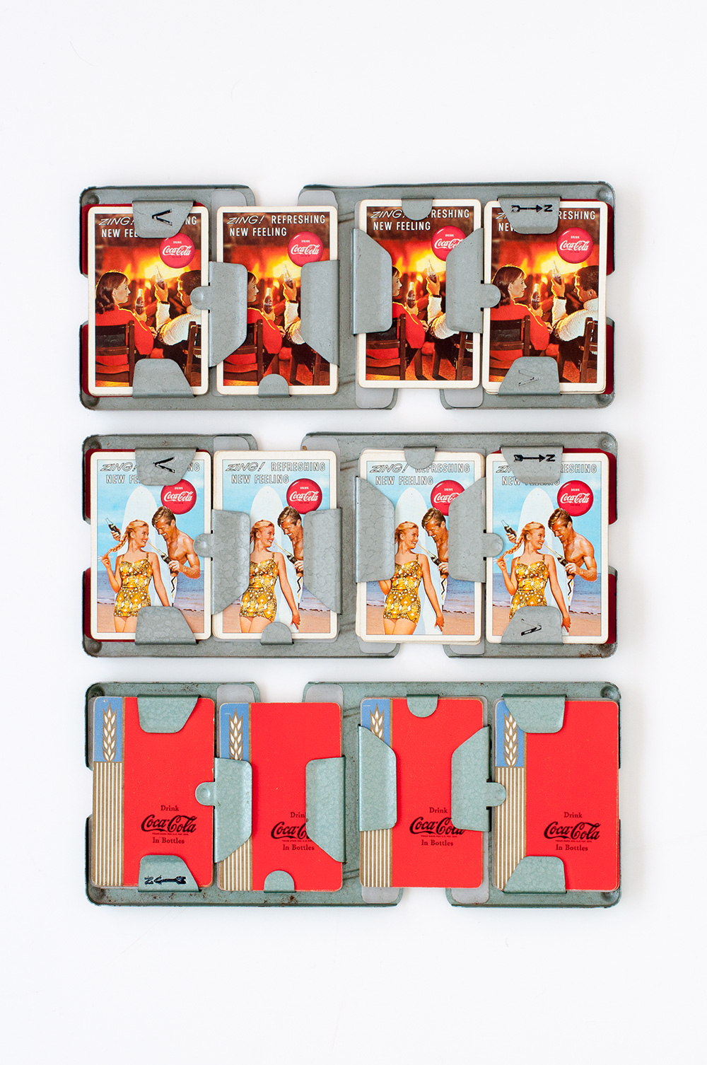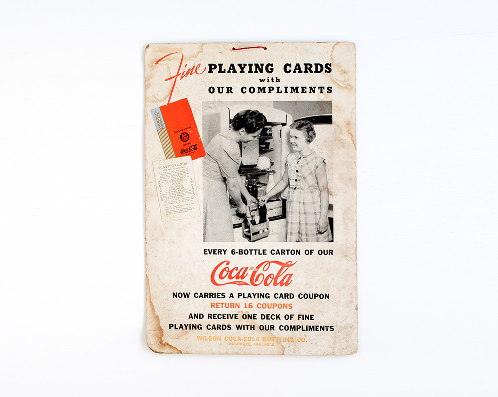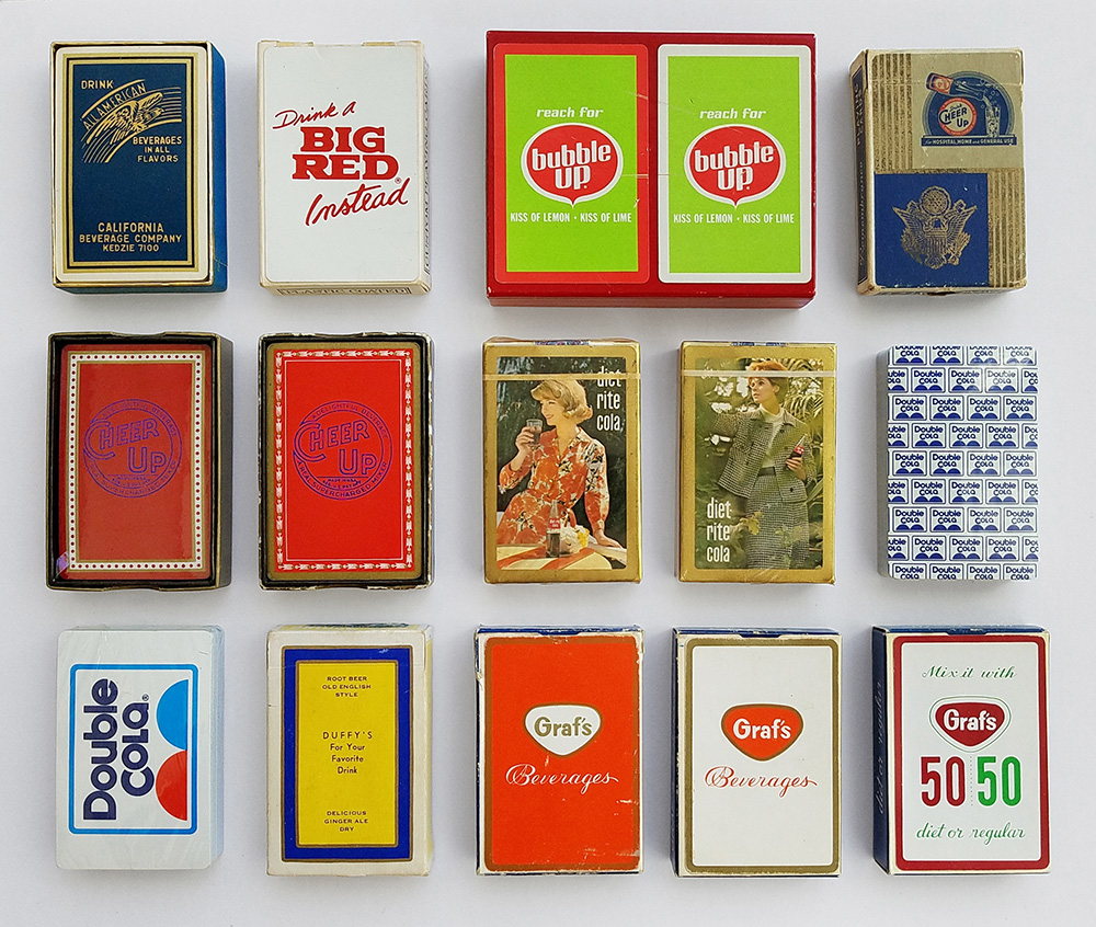 Coca Cola used just about any household item you could imagine for advertising, including playing cards, which were used in almost every American home. Some were ordered by the Company or could be ordered by bottlers through the Company, but many of the most unique decks were clearly ordered by individual bottlers, probably in relatively small lots. If you look at the pictures, you will see many of the same designs that were used by Coca Cola bottlers featuring other advertisers. You can imagine the playing card salesperson sitting down with the marketing person at a bottler and going through his samples of card designs, trying to get an order. Not the easiest life, and I would imagine you had to sell a lot of decks to make a decent commission.