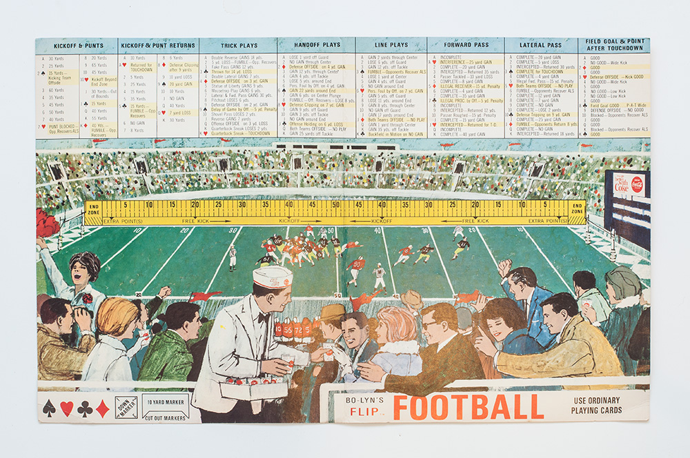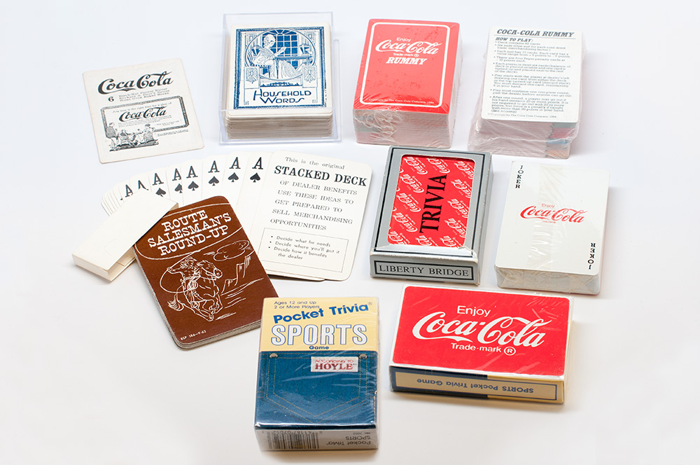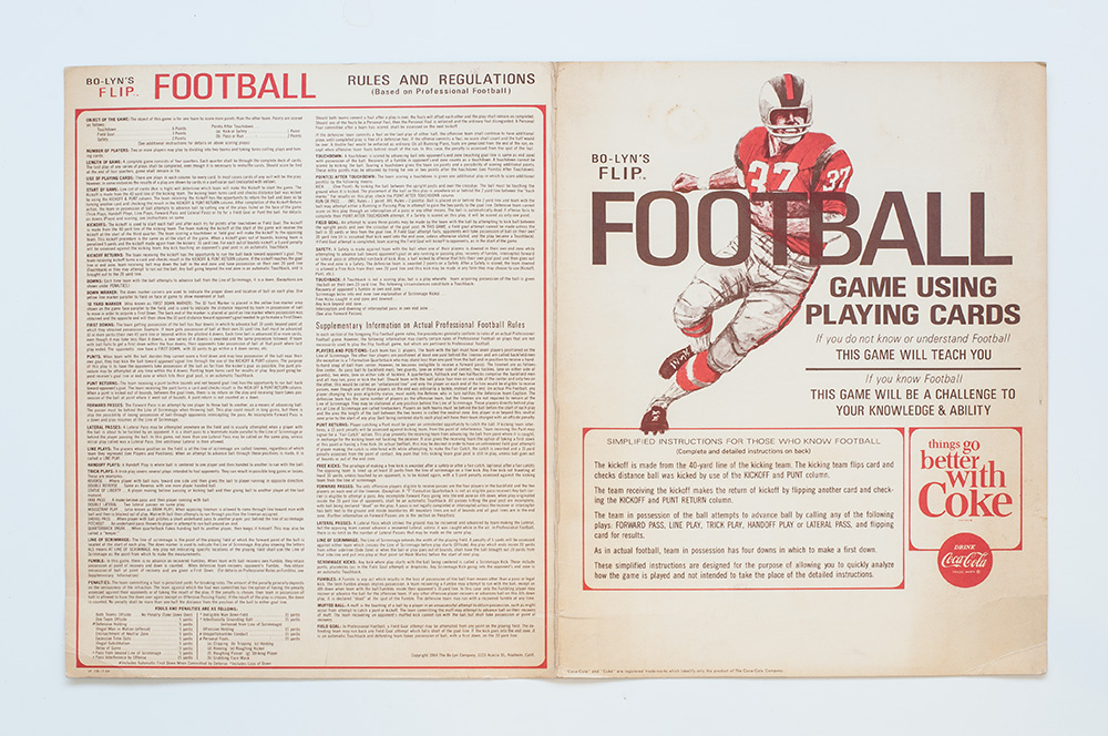 View in GalleryThe Company or others put out a few card decks, or materials relating to use of regular playing cards, that were for other games. There is a quite old Household Words deck that has a Coca Cola card. From other cards in the deck, it appears to be from Harrisburg, Pennsylvania and to date as far back as the 1920s. There is a more recent rummy set from 1984, with an Enjoy Coca-Cola red background. This was used for employees and had tips on merchandising. Note the Pepsi penalty card reference. There is a sports trivia deck, with an Enjoy Coca-Cola logo, probably from the 1970s. And there is a repeated pattern white Enjoy Coca-Cola on a red background Trivia deck, also likely dating to the 1970s. Finally, there is an interesting football game to be played with playing cards. Note the complex rules, which would probably discourage anyone from actually playing!